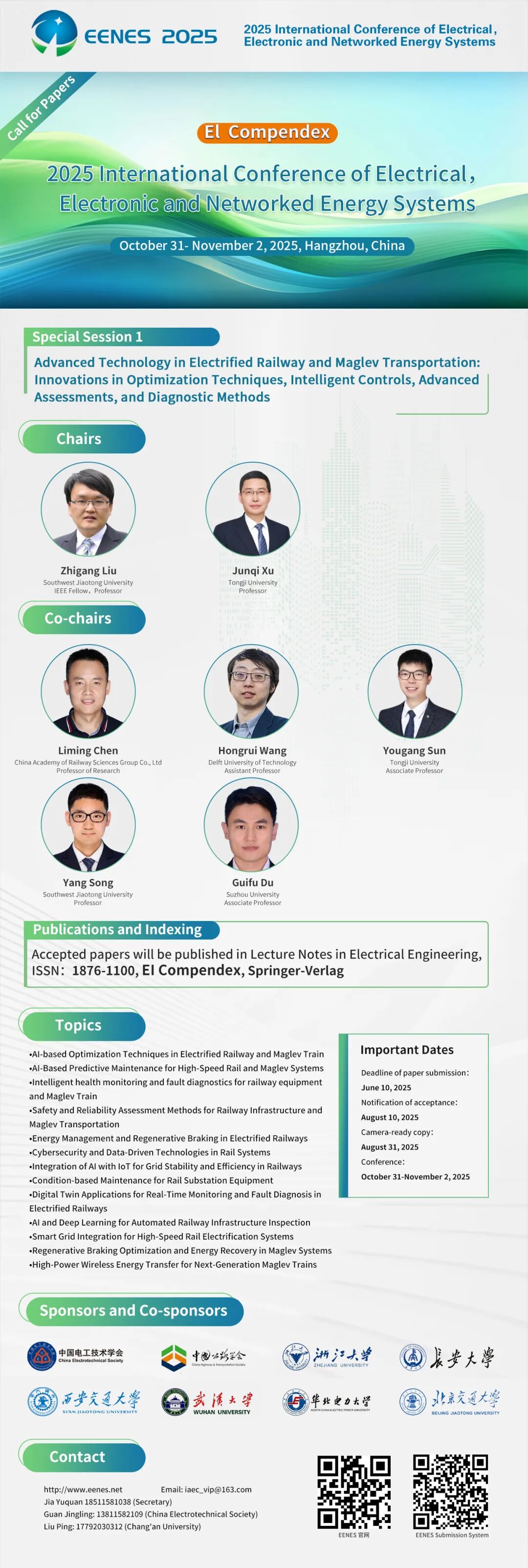 由中国电工技术学会等单位共同主办的2025年电气电子与网联化能源系统国际学术会议(EENES 2025)将于10月31日至11月2日在风景秀丽的杭州盛大召开。本次盛会由浙江大学、长安大学、西安交通大学、武汉大学、华北电力大学及北京交通大学共同承办。