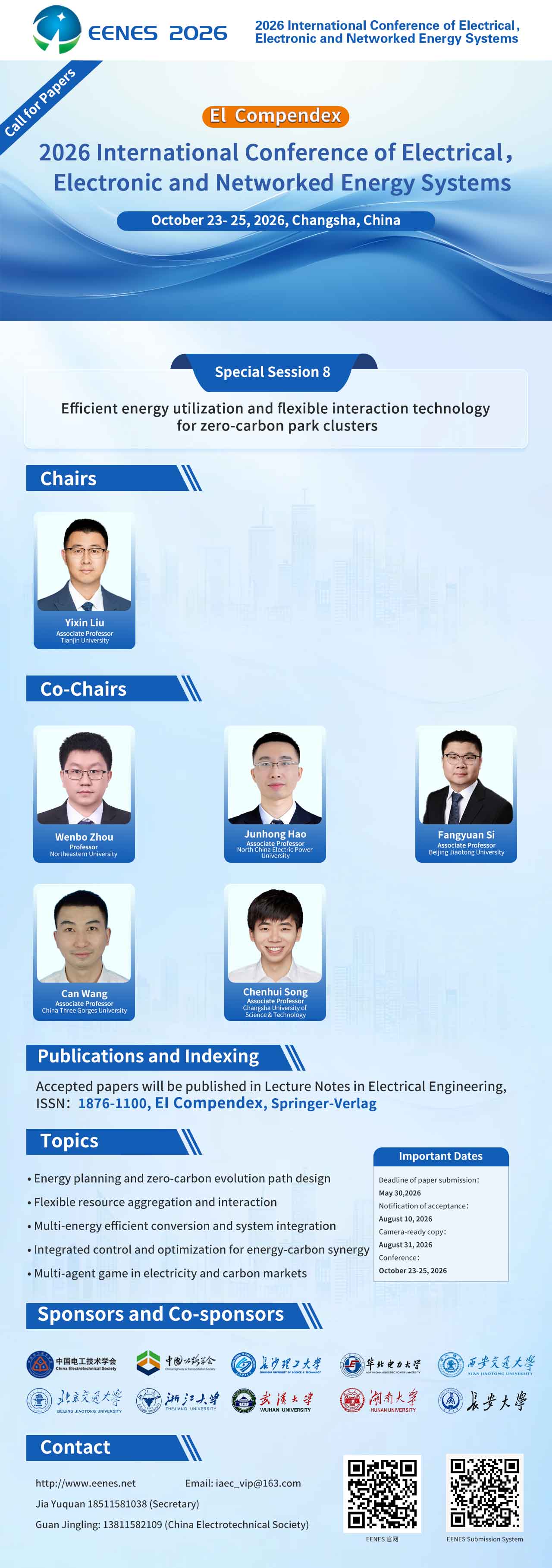 由中国电工技术学会等单位共同主办的2026年电气电子与网联化能源系统国际学术会议(EENES 2026)将于10月23日-25日在湖南长沙盛大召开。本次会议由长沙理工大学承办,由华北电力大学、西安交通大学、北京交通大学、浙江大学、武汉大学、湖南大学、长安大学协办。