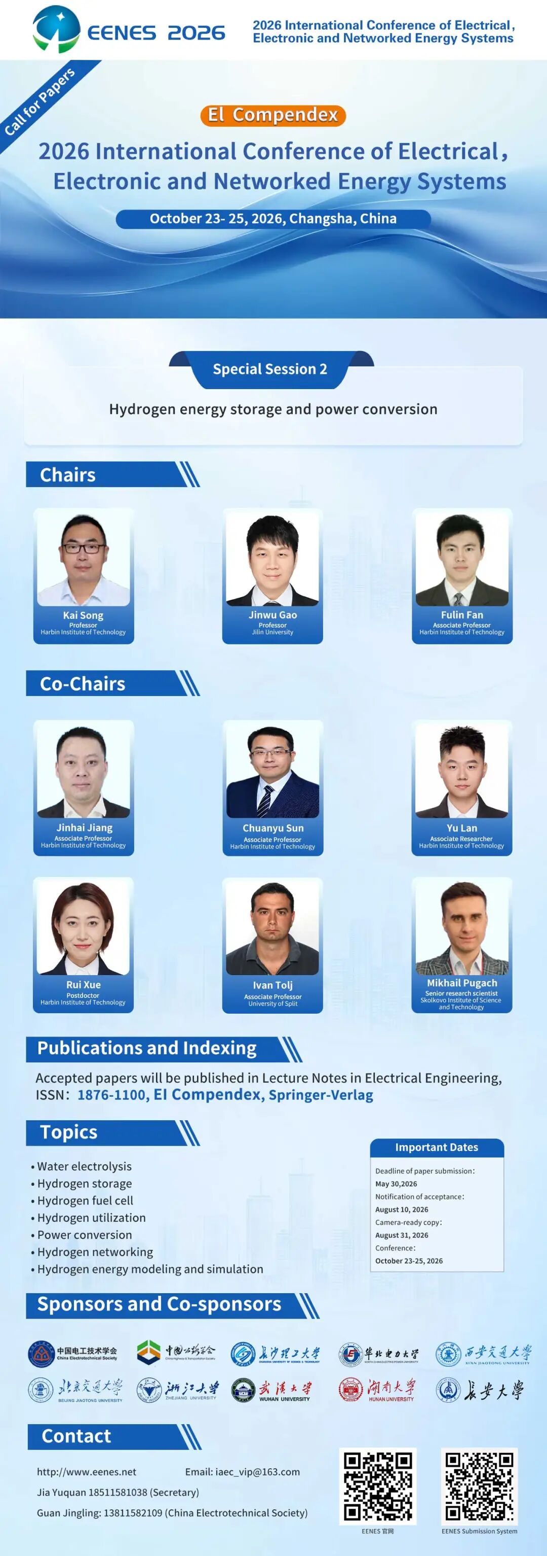 由中国电工技术学会等单位共同主办的2026年电气电子与网联化能源系统国际学术会议(EENES 2026)将于10月23日-25日在湖南长沙盛大召开。本次会议由长沙理工大学承办,由华北电力大学、西安交通大学、北京交通大学、浙江大学、武汉大学、湖南大学、长安大学协办。
