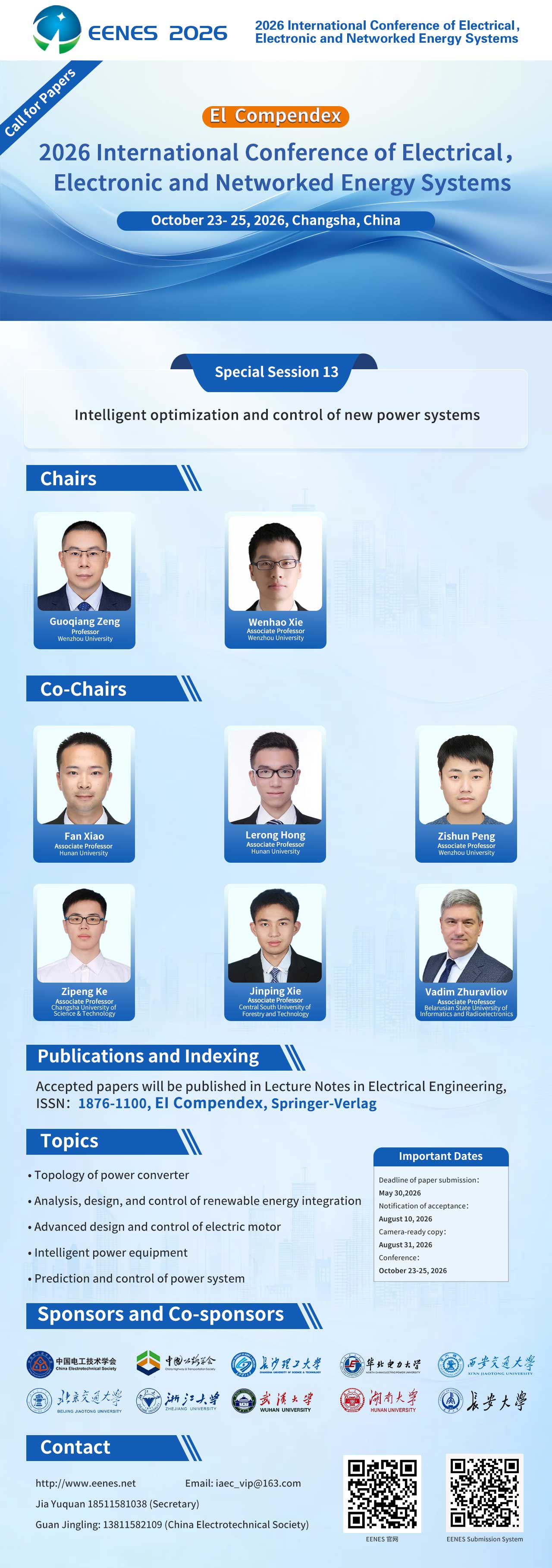 由中国电工技术学会等单位共同主办的2026年电气电子与网联化能源系统国际学术会议(EENES 2026)将于10月23日-25日在湖南长沙盛大召开。本次会议由长沙理工大学承办,由华北电力大学、西安交通大学、北京交通大学、浙江大学、武汉大学、湖南大学、长安大学协办。